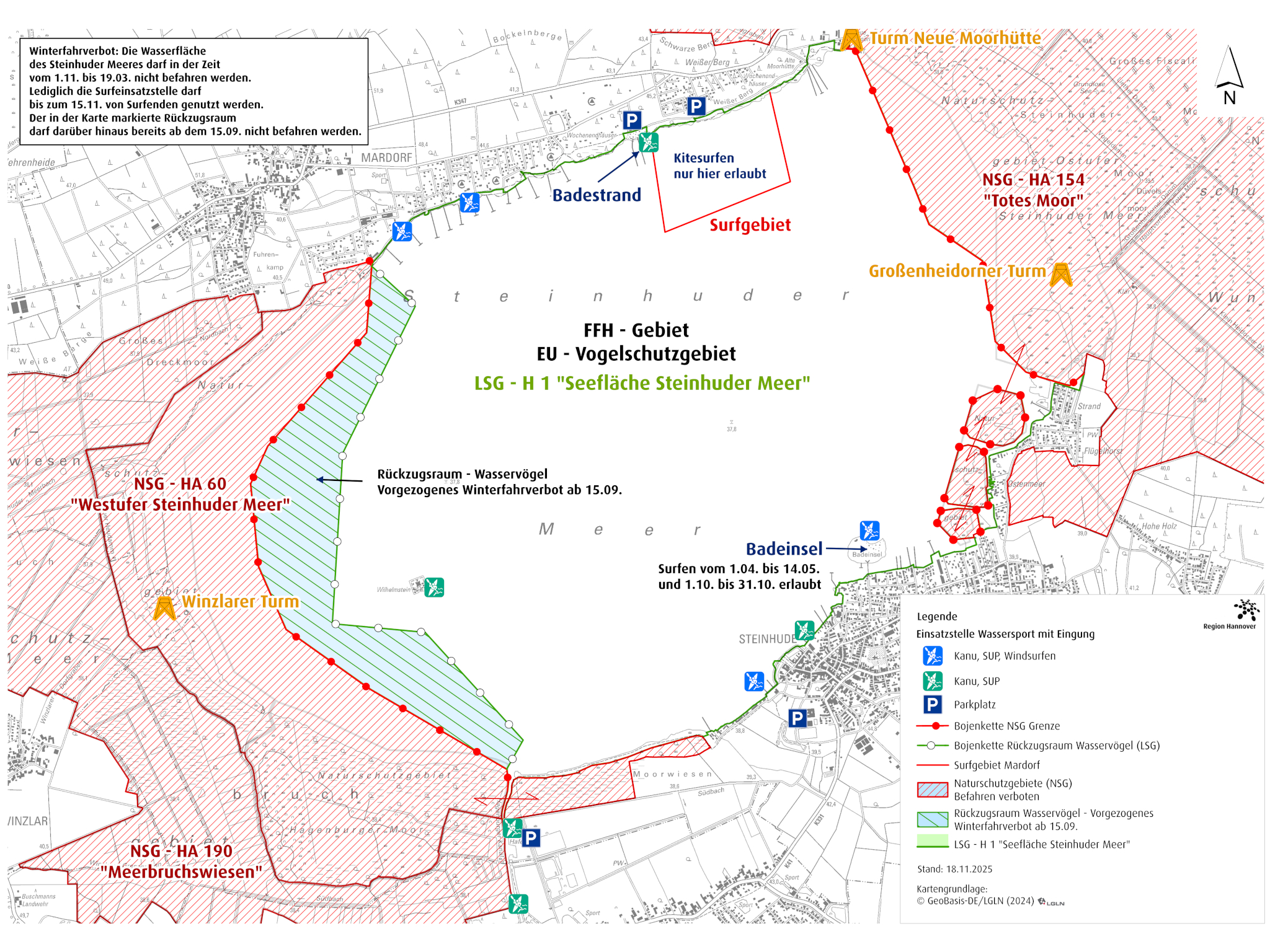 Die Region Hannover als Untere Naturschutzbehörde weist ergänzend darauf hin, dass Eisflächen in den Naturschutzgebieten „Westufer Steinhuder Meer“ und „Totes Moor“ am Ostufer auch auf eigene Gefahr nicht betreten werden dürfen, um die sensiblen Tierarten, die dort überwintern, nicht zu stören. Offene Wasserstellen dienen den Vögeln jetzt als wichtige Rückzugsgebiete und sollten auch zur eigenen Sicherheit nur mit großem Abstand umfahren oder umgangen werden.